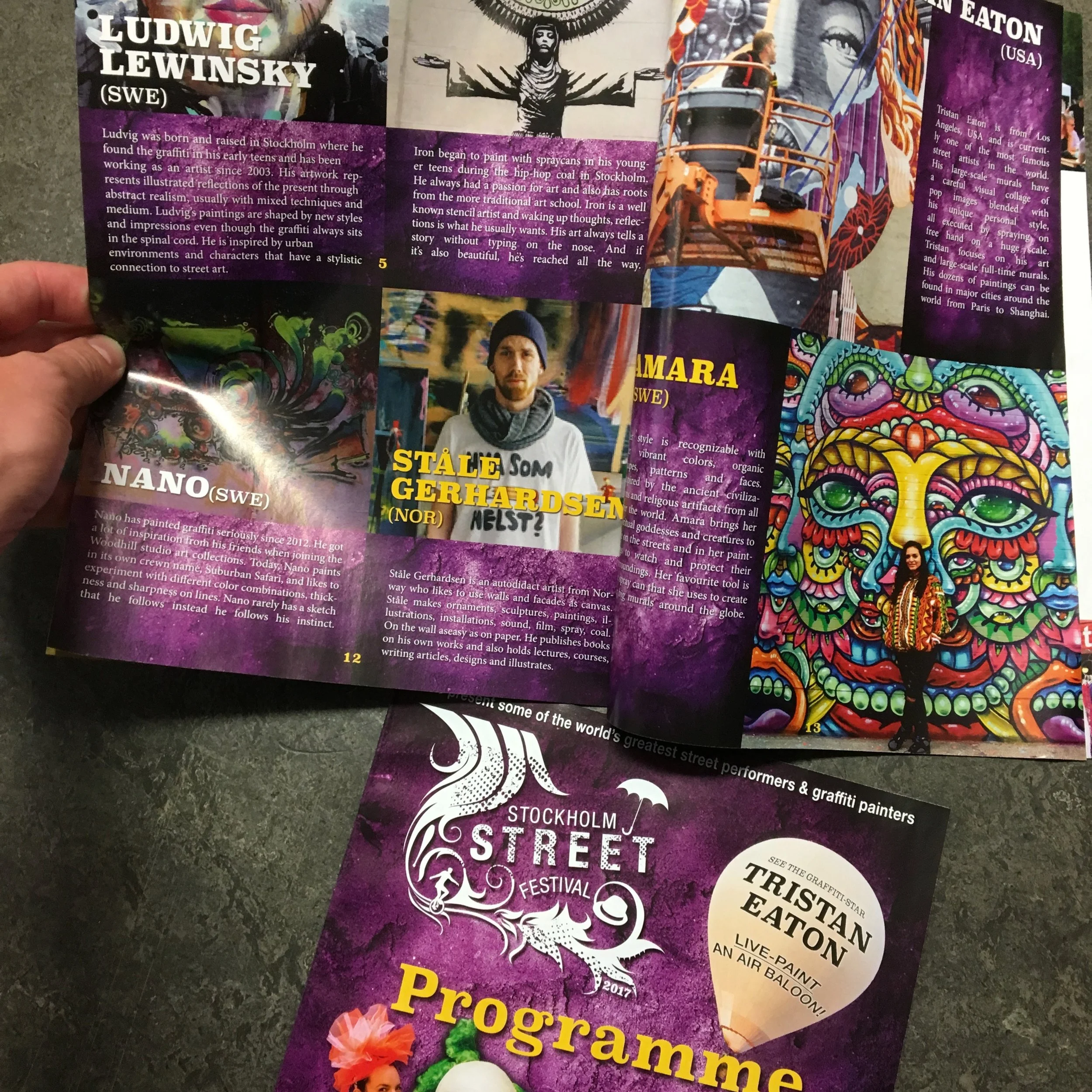 Gjengen i Wallery Gallery (som jeg lekte med tidligere i år) inviterte meg ned til Stockholm igjen for å male live på gatefestivalen Stockholm Street Festival. Det var stas. Fra 30. juni til 2. juli skulle jeg male vegg sammen en håndfull andre dyktige streetartflinkiser: Tristan Eaton (USA), Ludwig Lewinsky (SE), Amara Por Dios (SE), Iron (SE), Nano (SE).
